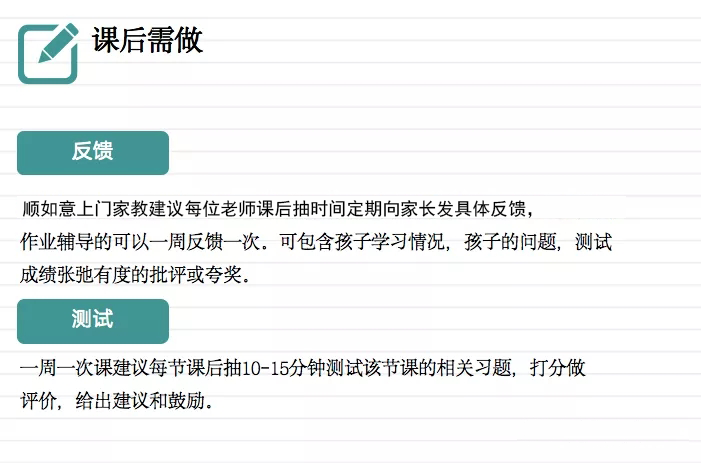 建议两次课进行一次测试,测试内容是自己上课的内容,遇到学生问题及时跟家长反馈。